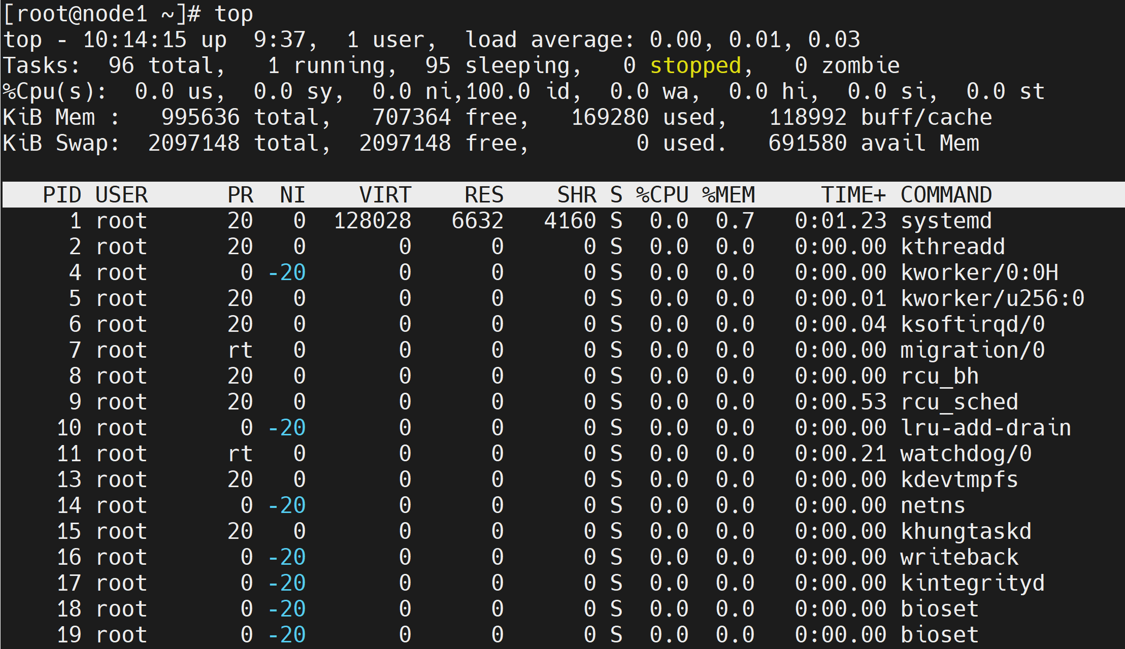 | load average: 0.00, 0.01, 0.03 | 系统负载(任务队列的平均长度),3 个数值分别为 1 分钟 |