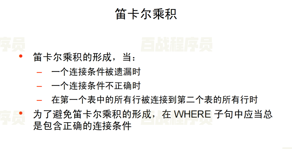 当一个连接条件无效或被遗漏时,其结果是一个笛卡尔乘积 (Cartesian product),其中所有行的组合都被显示。第一个表中的所有行连接到第二个表中的所有行。一个笛卡尔乘积会产生大量的行,其结果没有什么用。你应该在 WHERE 子句中始终包含一个有效的连接条件,除非你有特殊的需求,需要从所有表中组合所有的行。