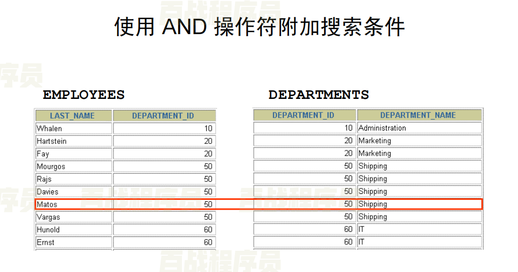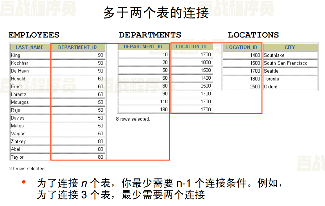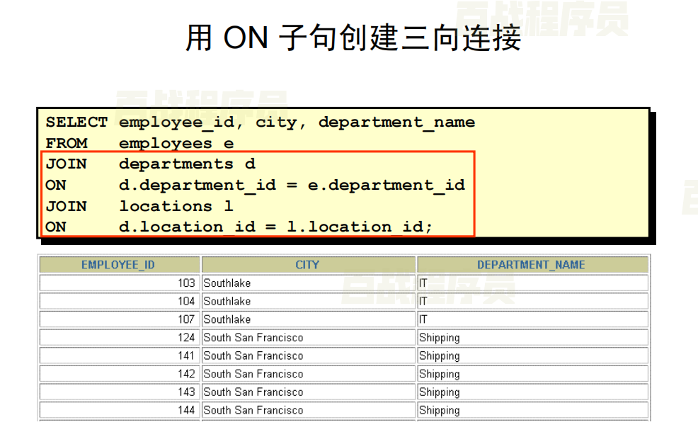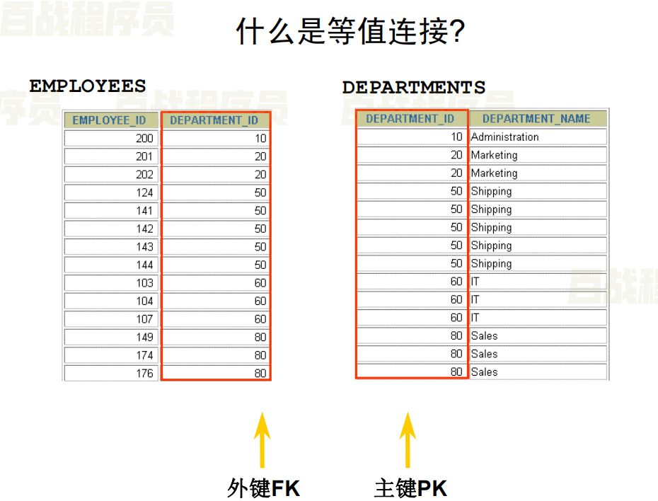 - EMPLOYEES.DEPARTMENT_ID = DEPARTMENTS.DEPARTMENT_ID,因为 DEPARTMENT_ID 列是两个表的同名列,它必须用表名做前缀以避免混淆。
