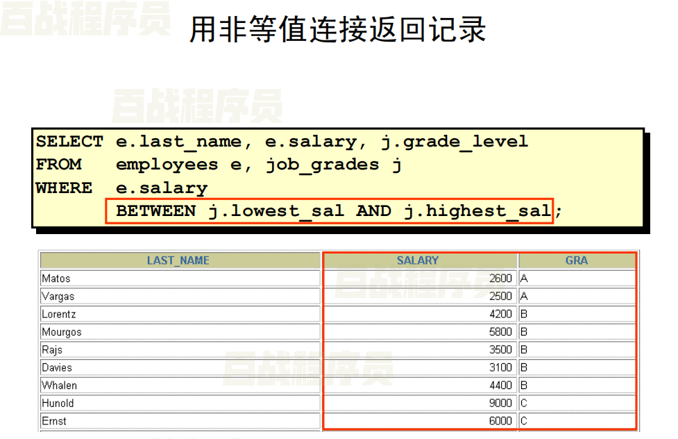 一个非等值连接是一种不同于等值操作的连接条件。 EMPLOYEES 表 和JOB_GRADES A 表之间的关系有一个非等值连接例子。在两个表之间的关系是EMPLOYEES 表中的 SALARY 列必须是 JOB_GRADES 表的 LOWEST_SALARY 和HIGHEST_SALARY 列之间的值。使用不同于等于 (=) 的操作符获得关系。