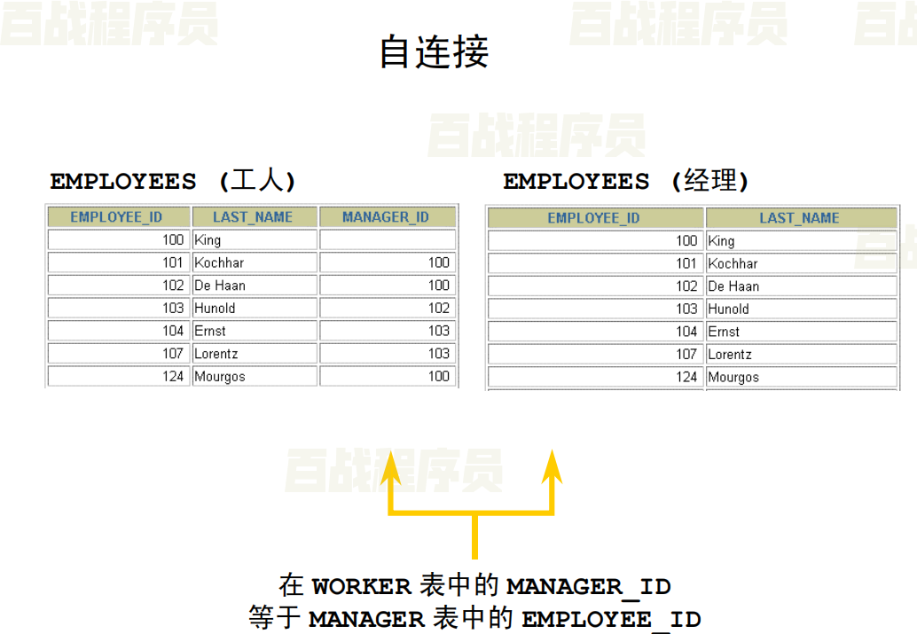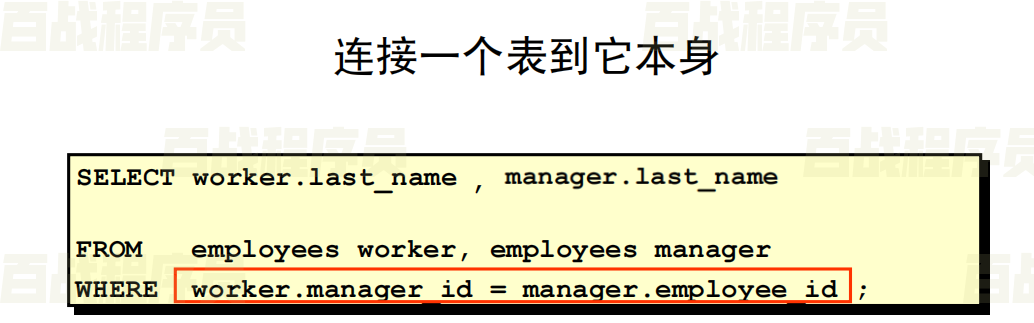 图片中的例子连接 EMPLOYEES 表到它自己。为了在 FROM 子句中模拟两个表,对于相同的表 EMPLOYEES,用两个别名,分别为 worker 和 manager。在该例中,WHERE 子句包含的连接意味着 “一个工人的经理号匹配该经理的雇员号”。