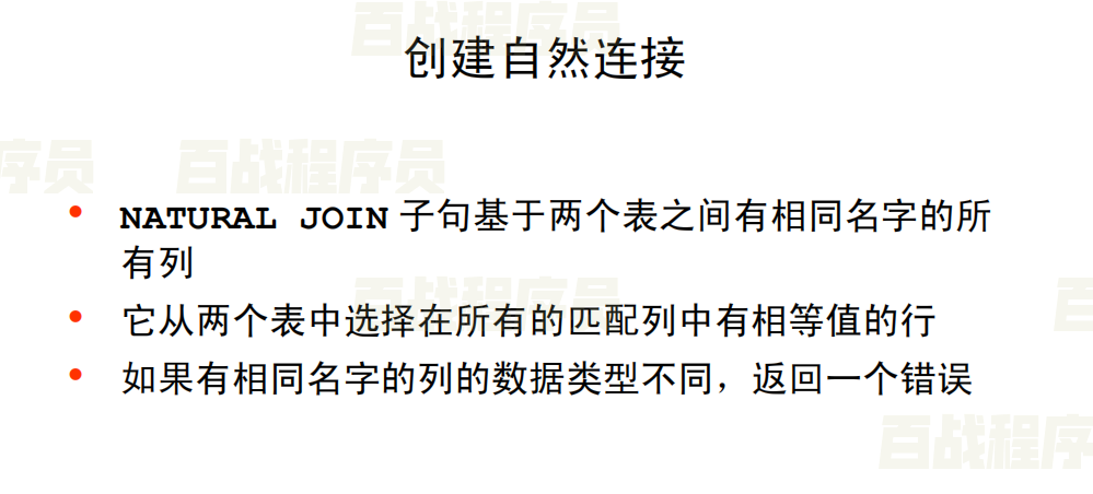连接只能发生在两个表中有相同名字和数据类型的列上。如果列有相同的名字,但数据类型不同,NATURAL JOIN 语法会引起错误。