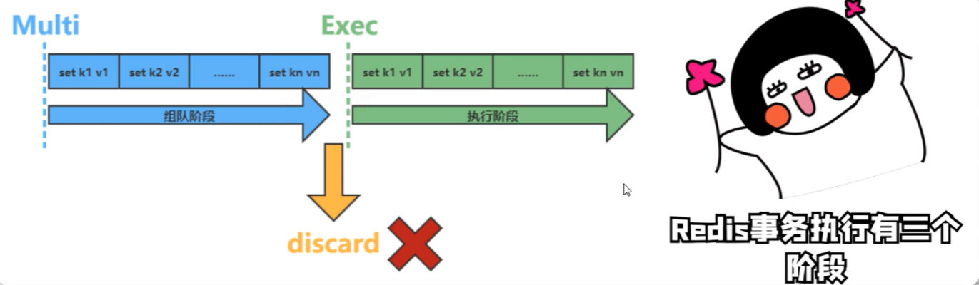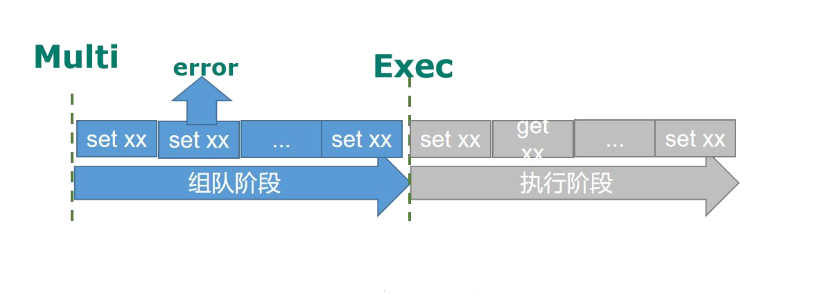 事务从输入Multi命令开始,输入的命令都会依次压入命令缓冲队列中,并不会执行,直到输入Exec后,Redis会将之前的命令缓冲队列中的命令依次执行。组队过程中,可以通过discard来放弃组队。