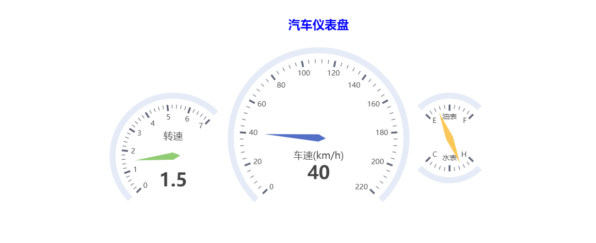 前面介绍的单仪表盘,相对比较简单,只能表示一类事物的范围情况。 如果需要同时表现几类不同事物的范围情况,那么应该使用多仪表盘进行展示。利用汽车的速度、发动机的转速、油表和水表的数据展示汽车的现状
