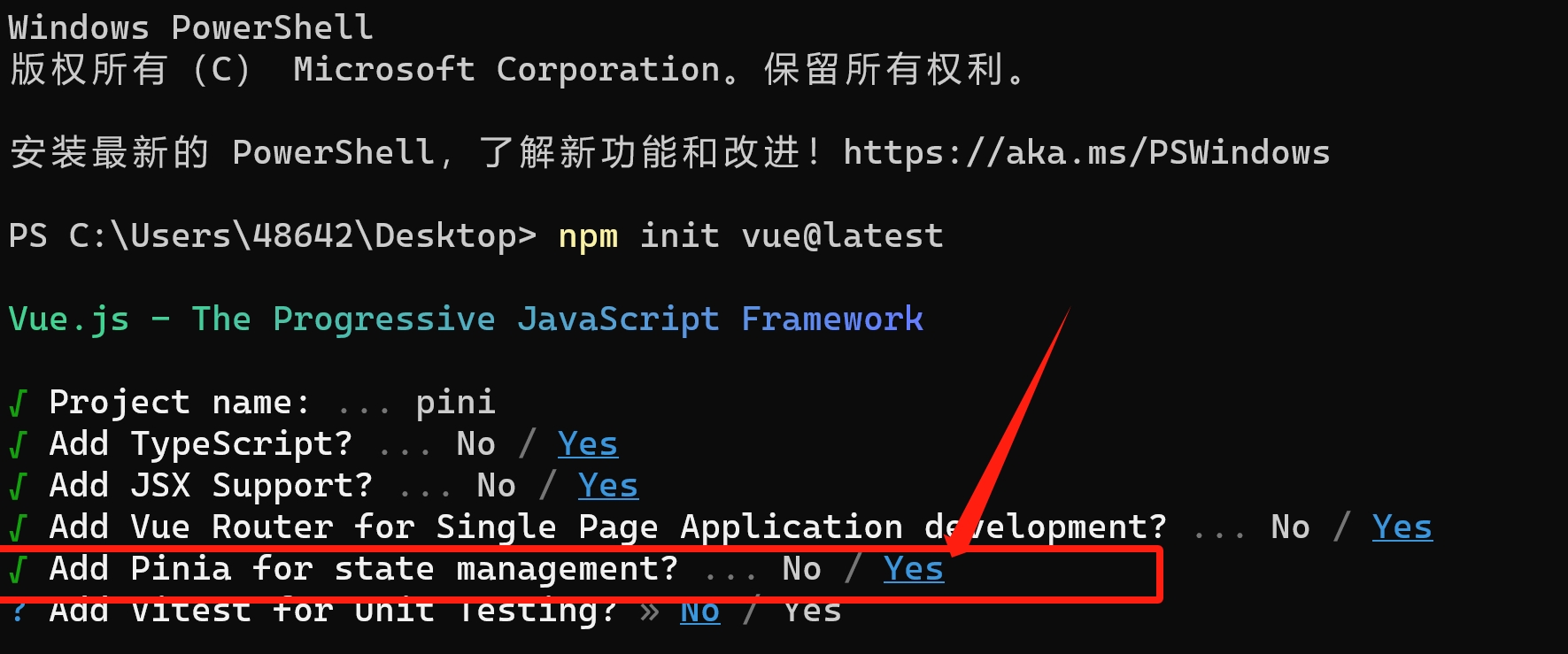 npm init vue@latest将 Pinia 集成进去