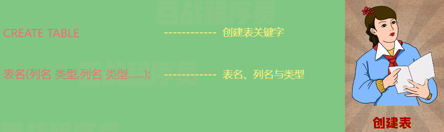 CREATE TABLE 表名(列名 类型,列名 类型......);示例:创建一个 employees 表包含雇员 ID ,雇员名字,雇员薪水。