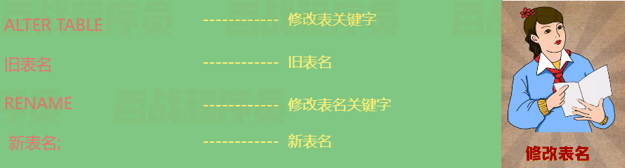 ALTER TABLE 旧表名 RENAME 新表名;示例: