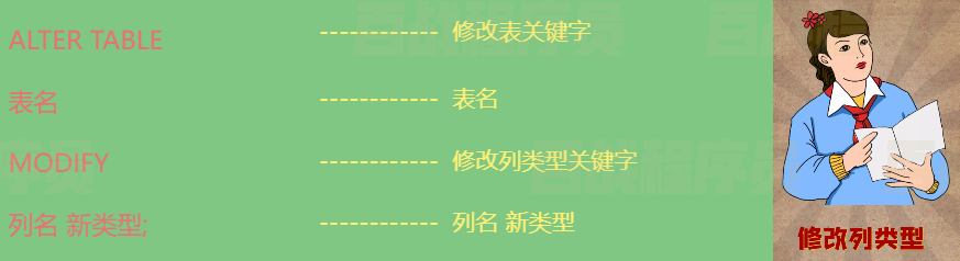 ALTER TABLE 表名 MODIFY 列名 新类型;示例:将 emp 表中的 name 的长度指定为 40。