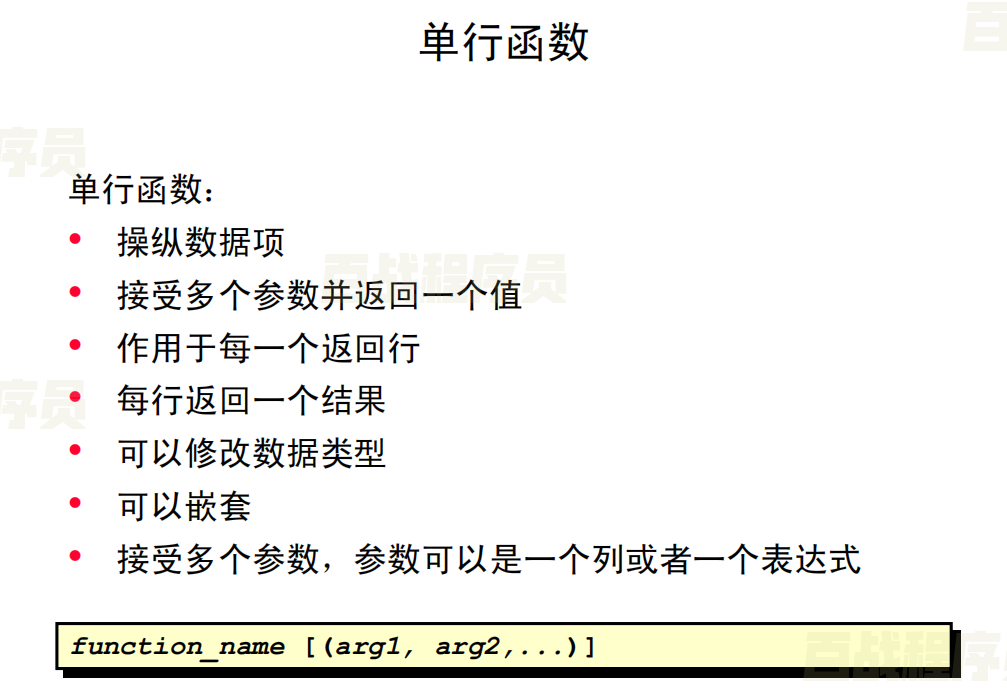 单行函数仅对单个行进行运算,并且每行返回一个结果。常见的函数类型有字符、数字、日期、转换
