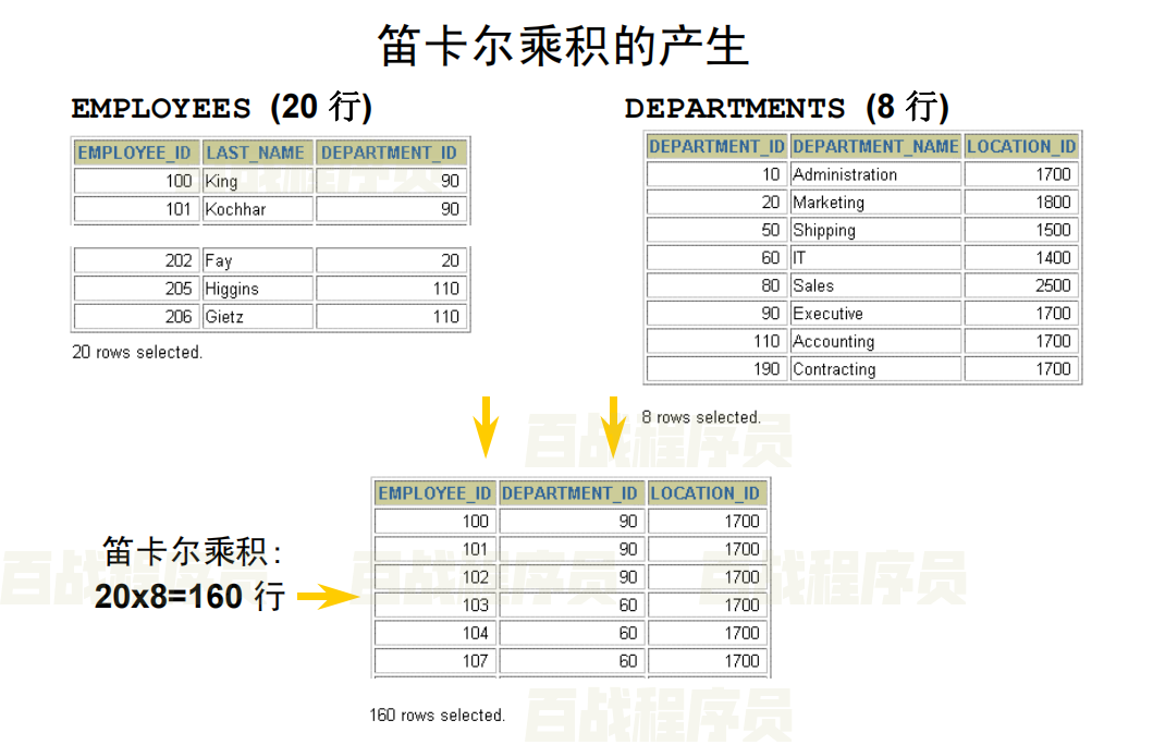 当一个连接条件无效或被遗漏时,其结果是一个笛卡尔乘积 (Cartesian product),其中所有行的组合都被显示。第一个表中的所有行连接到第二个表中的所有行。一个笛卡尔乘积会产生大量的行,其结果没有什么用。你应该在 WHERE 子句中始终包含一个有效的连接条件,除非你有特殊的需求,需要从所有表中组合所有的行。
