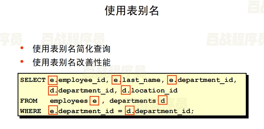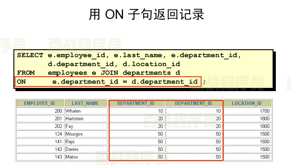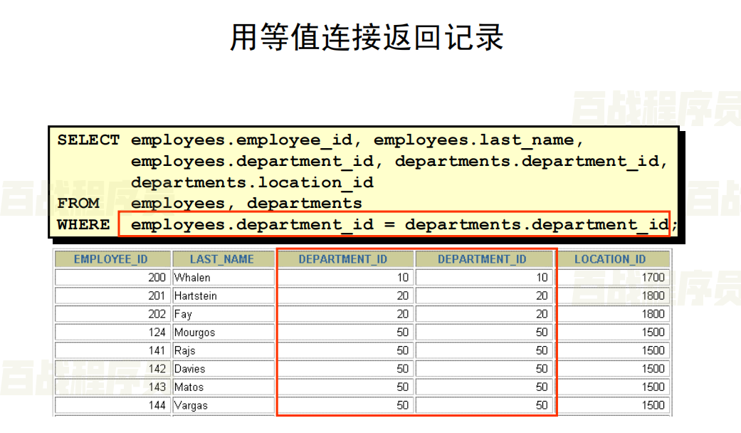 - EMPLOYEES.DEPARTMENT_ID = DEPARTMENTS.DEPARTMENT_ID,因为 DEPARTMENT_ID 列是两个表的同名列,它必须用表名做前缀以避免混淆。