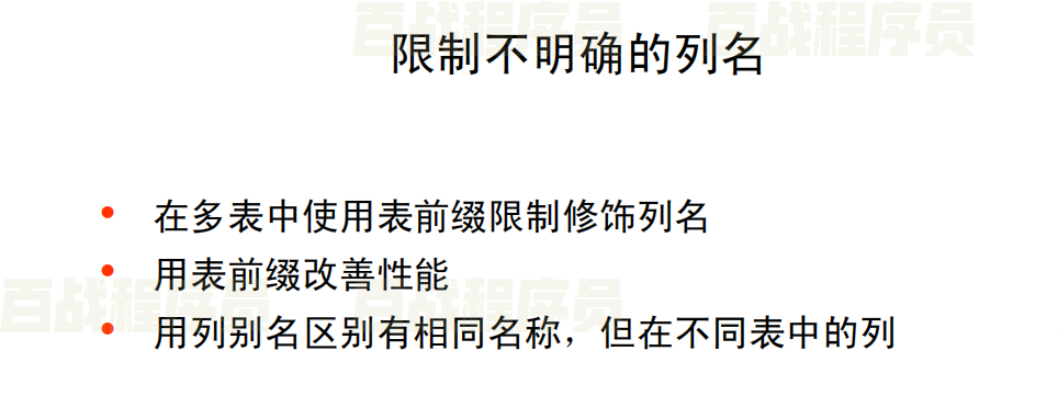 - 如果列名在两个表之间不相同,就不需要限定列。但是,使用表前缀可以改善性能,因为MySQL服务器可以根据表前缀找到对应的列。