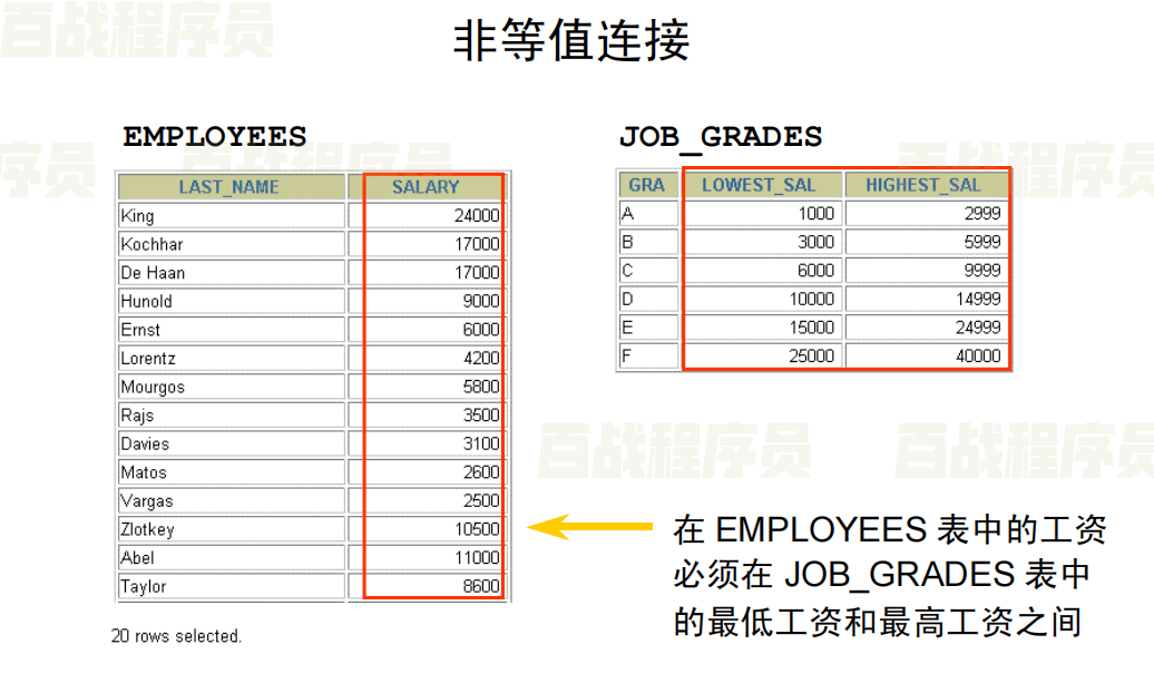 一个非等值连接是一种不同于等值操作的连接条件。 EMPLOYEES 表 和JOB_GRADES A 表之间的关系有一个非等值连接例子。在两个表之间的关系是EMPLOYEES 表中的 SALARY 列必须是 JOB_GRADES 表的 LOWEST_SALARY 和HIGHEST_SALARY 列之间的值。使用不同于等于 (=) 的操作符获得关系。