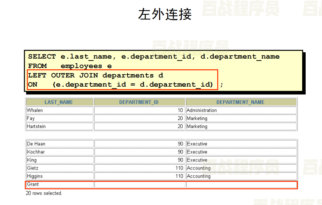 左边的表 (EMPLOYEES) 中即使没有与 DEPARTMENTS 表中匹配的行,该查询也会取回 EMPLOYEES 表中所有的行。