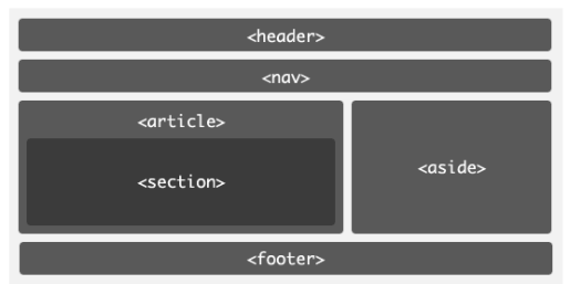<header></header>头部<nav></nav>导航<section></section>定义文档中的节,比如章节、页眉、页脚<aside></aside>侧边栏<footer></footer>脚部<article></article>代表一个独立的、完整的相关内容块,例如一篇完整的论坛帖子,一篇博客文章,一个用户评论等