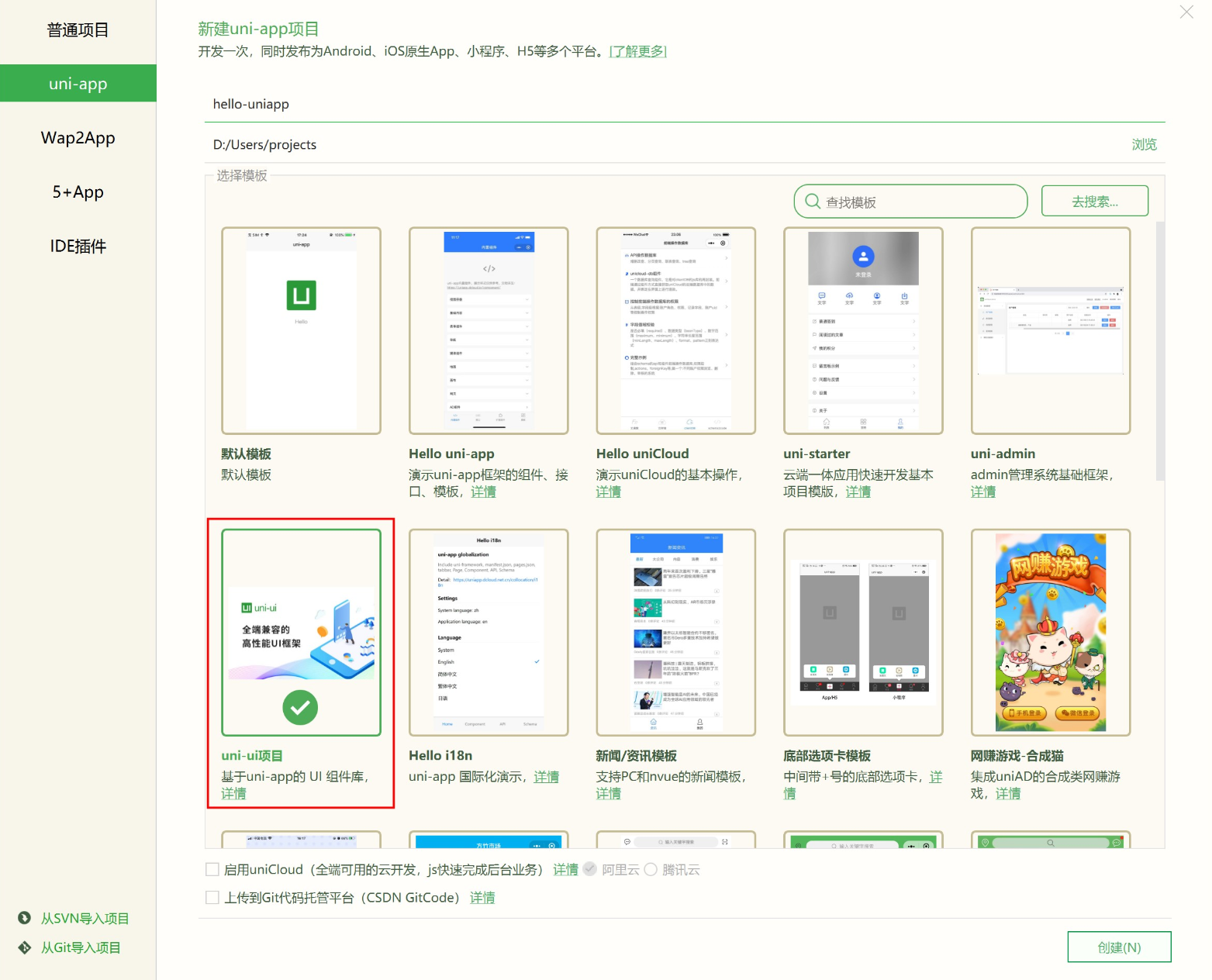 选择 uni-app 类型,输入工程名,选择模板,点击创建,即可成功创建