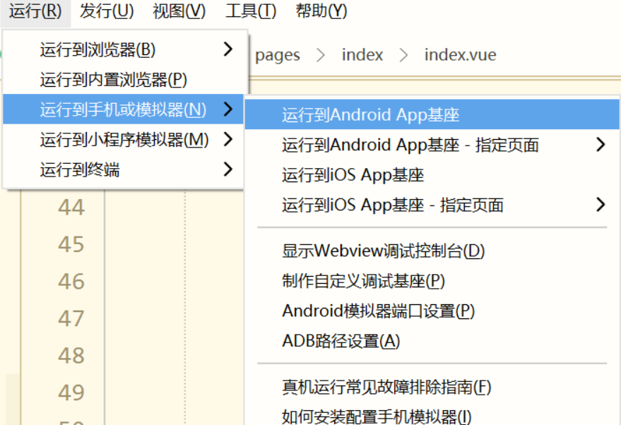 - 运行 App 到手机或模拟器:使用电压足够的 usb 端口连接手机,设置中开启 USB 调试,手机上允许电脑设备调试手机,进入 hello-uniapp 项目,点击工具栏的运行 -> 运行 App 到手机或模拟器,即可在该设备里面体验 uni-app