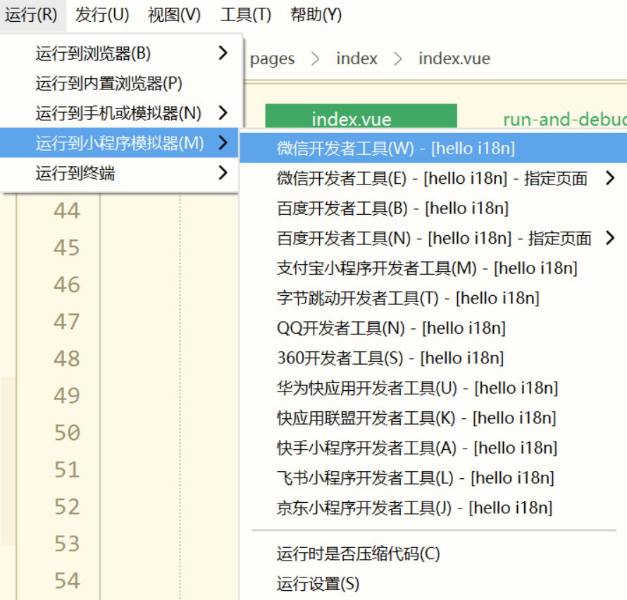 - 在微信开发者工具里运行:进入 hello-uniapp 项目,点击工具栏的运行 -> 运行到小程序模拟器 -> 微信开发者工具,即可在微信开发者工具里面体验 uni-app